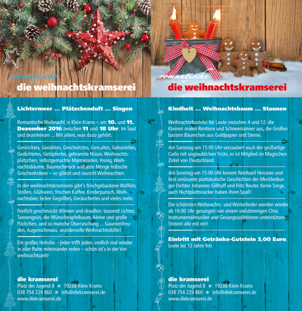 Romantische Weihnacht in Klein Krams – am 12. und 13. Dezember 2015 ab 11 Uhr. Im Saal und drumherum ... Mit allem, was dazu gehört: Gestricktes, Genähtes, Geschnitztes, Gemaltes, Gebasteltes, Gedichtetes, Getöpfertes, gebrannte Nüsse, Weihnachtsplätzchen, selbstgemachte Marmeladen, Honig, Weihnachtsbäume, Baumschmuck und jede Menge hübsche Geschenkideen – so glänzt und rauscht Weihnachten.