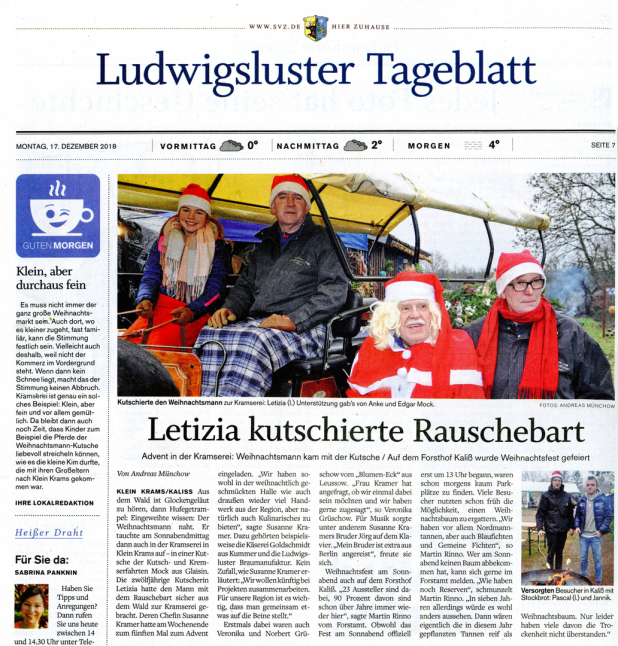 10. + 11.12.22* die 8. weihnachtskramserei mit kunsthandwerklichen Hütten im Saal und auf dem festlich geschmückten Außengelände. Los geht es jeweils um 11 Uhr. die kramserei-Crew bietet Kaffeespezialitäten mit und ohne Alkohol, Kinderpunsch, Weihnachtsbier, Glühwein, Plätzchen, Lebkuchen, Kuchen und Torten. Außerdem Grillwürstchen, Steaks und Soljanka – etwas Warmes braucht der Mensch ... Nachmittags wird gesungen und musiziert, die etwas andere Weihnachtsgeschichte vorgetragen und eine Tombola zugunsten der Tafel in Ludwigslust lässt alle Lose 100%ig gewinnen. Nehmen Sie Platz an der festlich gedeckten Tafel und bestaunen Sie den über und über geschmückten Christbaum im wohl größten Weihnachtswohnzimmer Mecklenburgs – herzlich willkommen am Platz der Jugend in Klein Krams.
